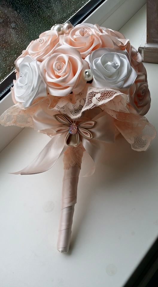 Zeer mooi zalmrose boeket afgewerkt met kant en lint.